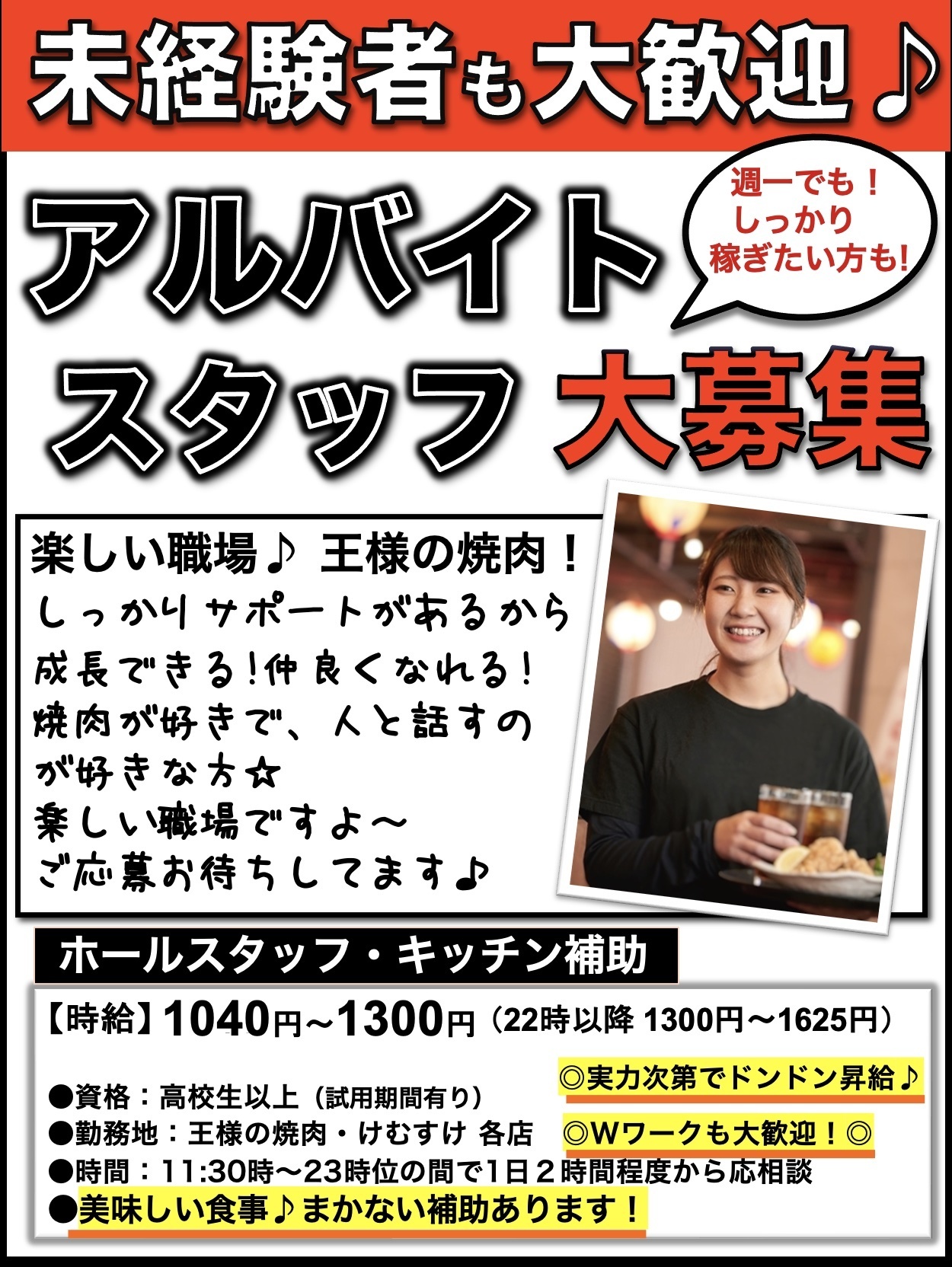 接客、調理の業務を経験できますのでスキルアップしたい方にもオススメです。